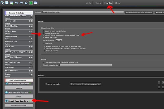 Escoges el elemento llamado “Default Video Spot Style” y activas la opción “Mostrar botones Reproducir y Detener sobre el video”… ¡y listo!