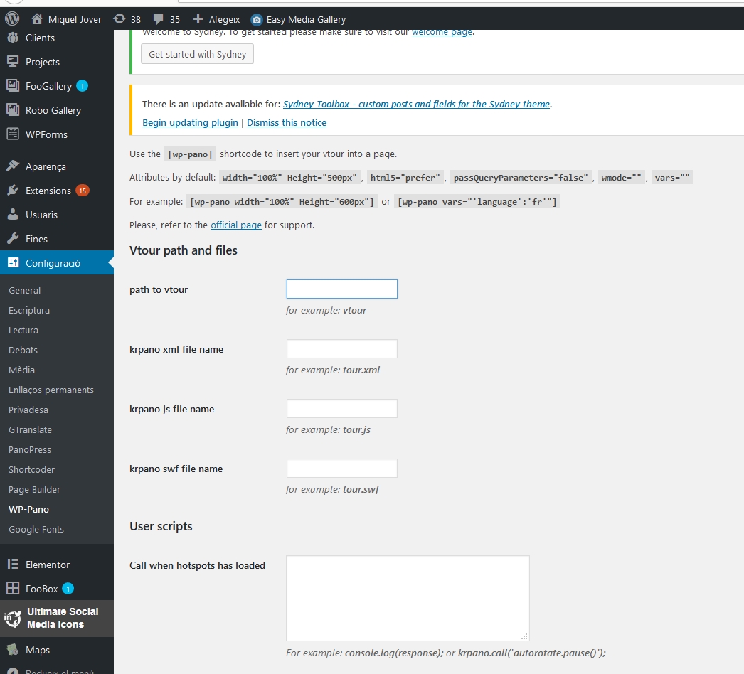 Por otro lado, tambien he intentado montar algun tour virtual en mi web de wordpress con el plugin WP-pano, y de nuevo no me aclaro. En la captura de pantalla, en el campo “path to vtour”, que informacion hay que poner, la ruta hacia la carpeta donde tenemos el tour virtual?