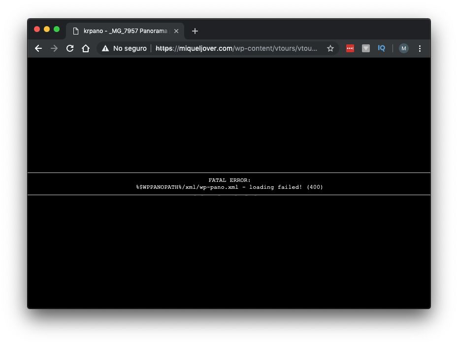 - Una vez hecho esto, escribí en un navegador la ruta “https://miqueljover.com/wp-content/vtours/vtour/tour.html”, y es cuando me sale ese mensaje de error.