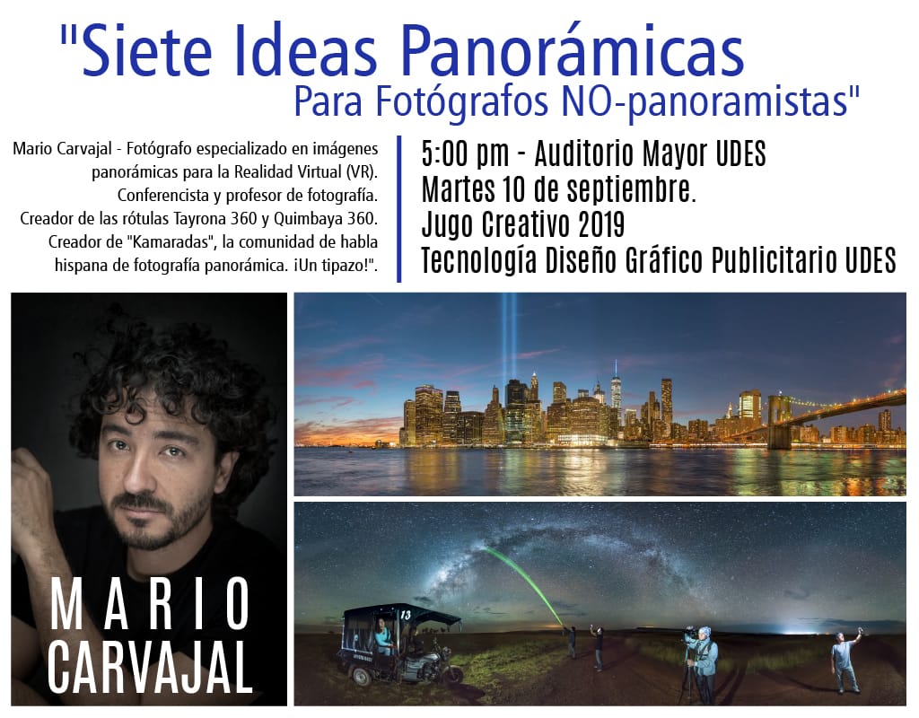 Estaré el martes 10 de septiembre de 2019 en Bucaramanga, Colombia, en el Auditorio Mayor UDES haciendo la segunda versión de la conferencia “Siete Ideas Panorámicas, para fotógrafos NO-Panoramistas”.