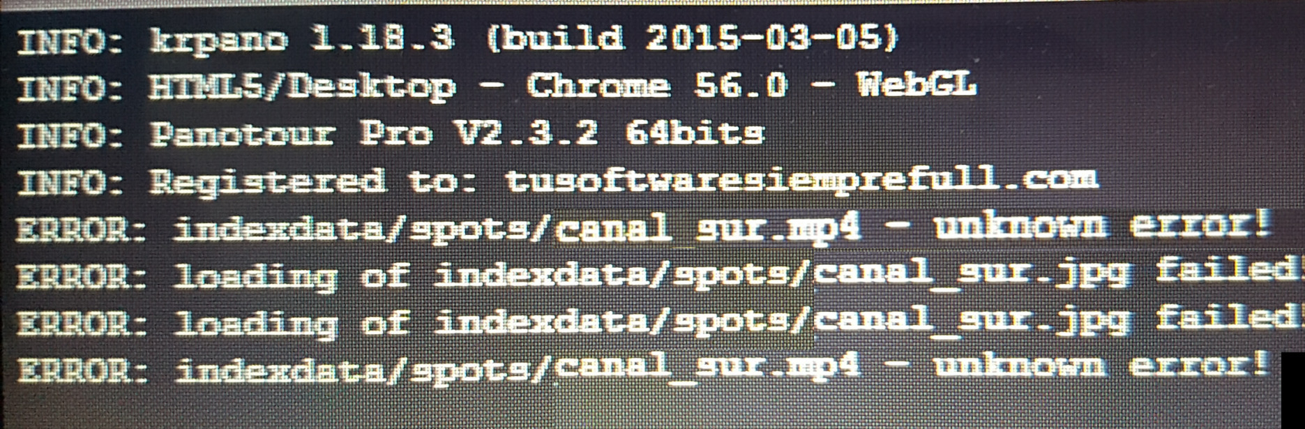 Tengo un problemilla, cuando inserto un vídeo en un Tour (Por ejemplo en la TV del salón) Desde Panotour puedo visualizarlo sin ningún error pero cuando lo publico en Internet y voy a visualizar la panorámica del Salón me da el error de la imagen que adjunto. ¿Algún consejo? Gracias de ante mano. Un abrazo a tod@s.