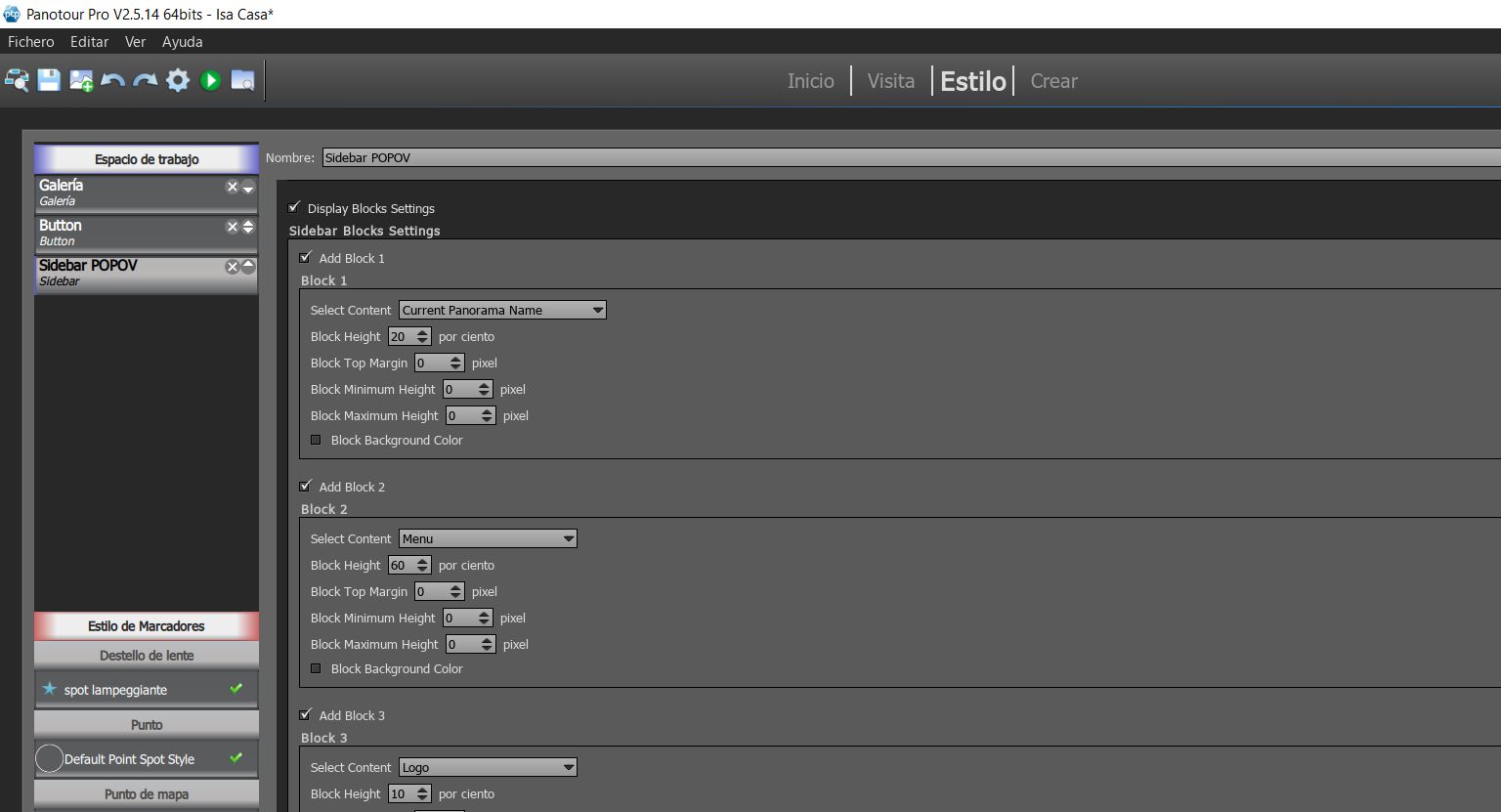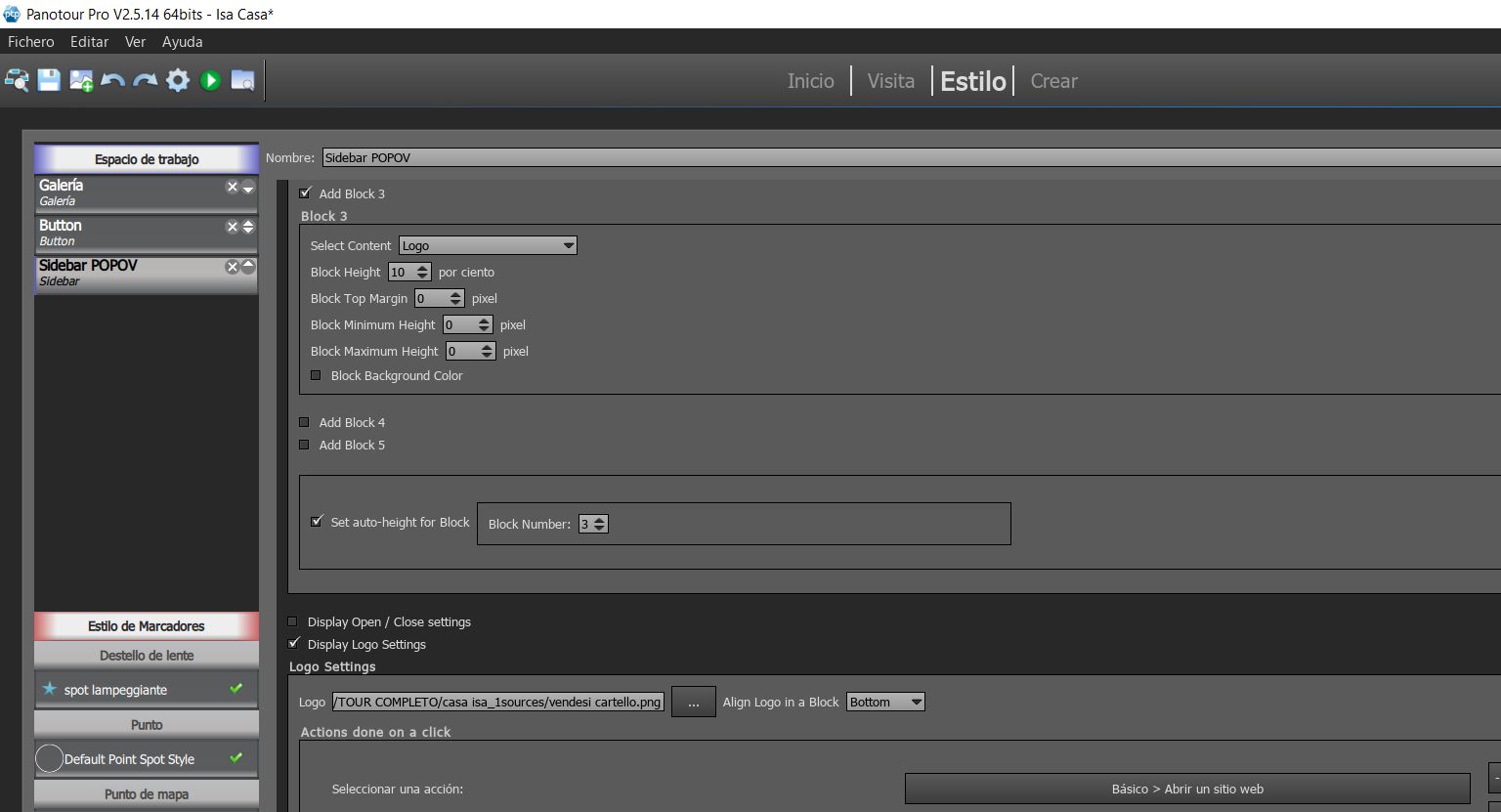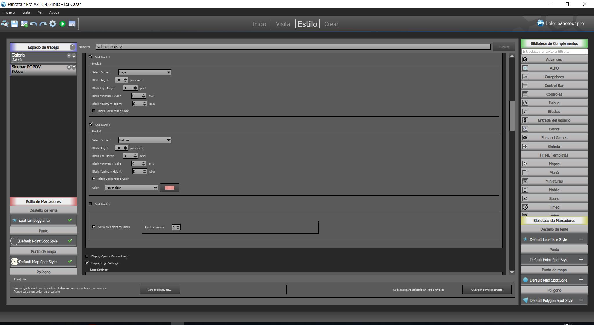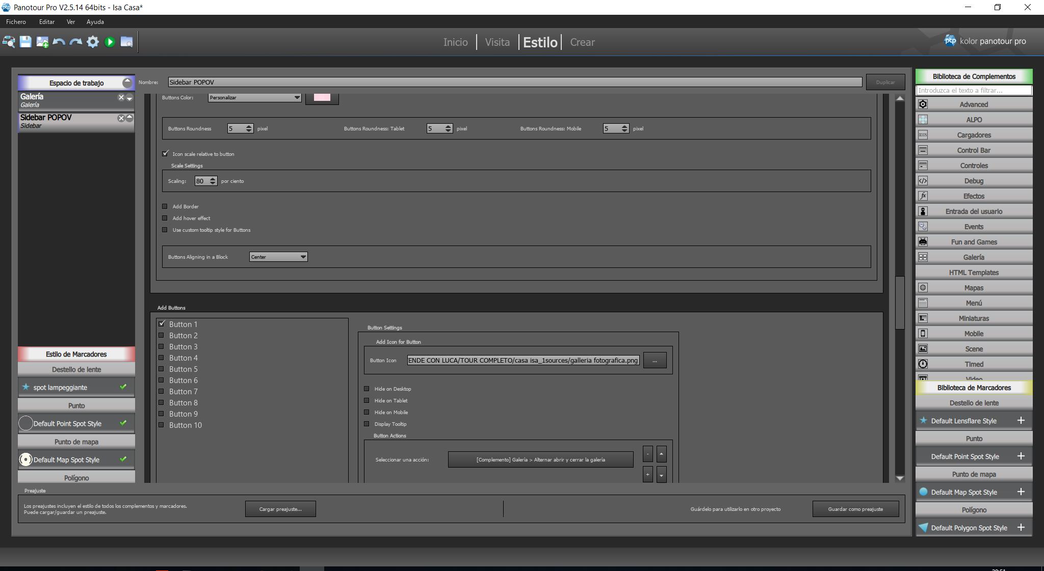 Para incluír botones “Button” en el Sidebar primero debes decirle donde va y después lo qué va a hacer el botón. Del mismo modo que añadiste bloques para el Nombre del Panorama que Estás Viendo (Add Block 1, Current Panorama Name), el Menu (Add Block 2, Menu), y el Logo (Add Block 3, Logo) (Capture_01172019_201648_risultato), debes añadir un bloque para los botones (sería: Add Block 4, Buttons).