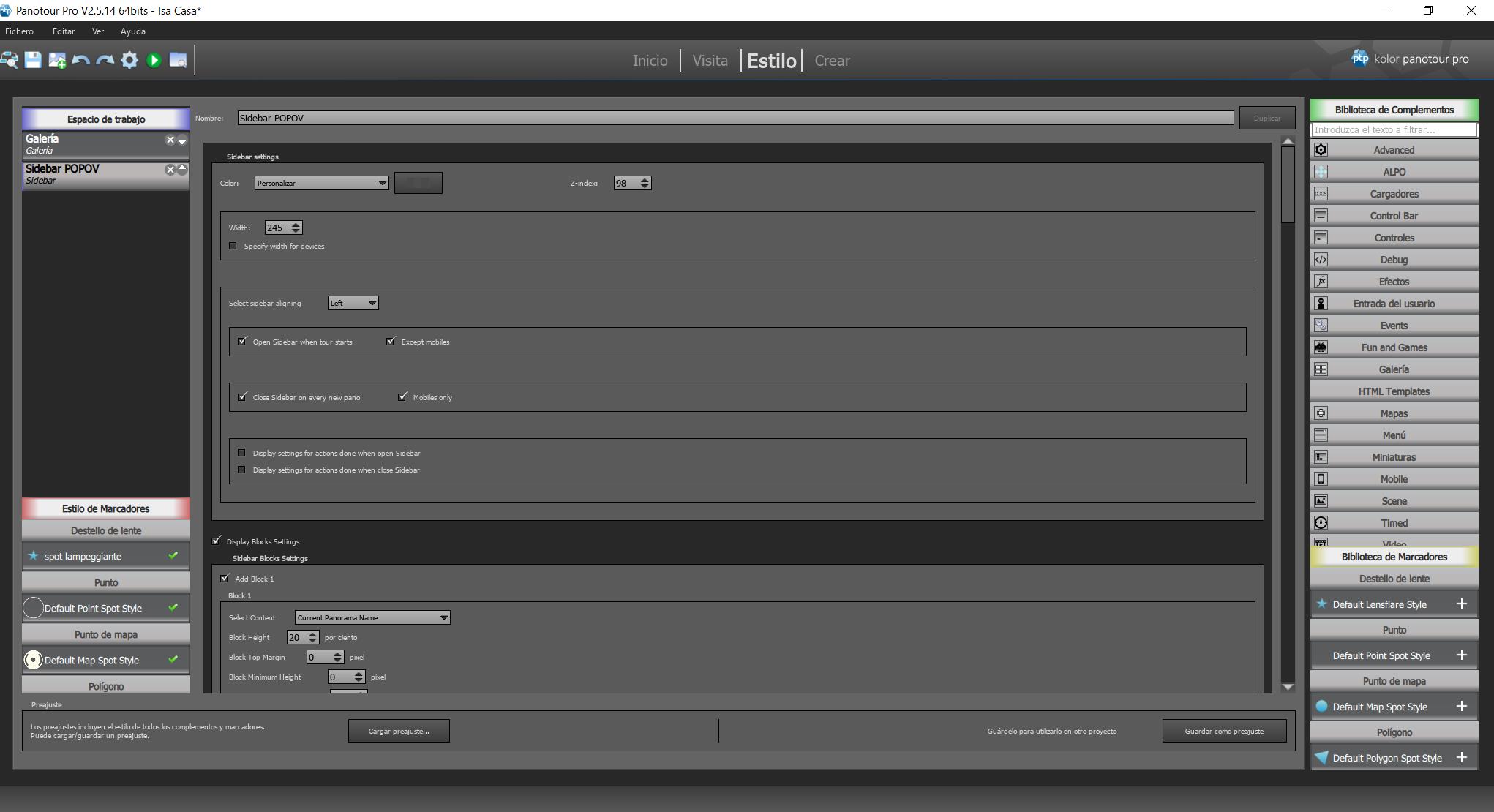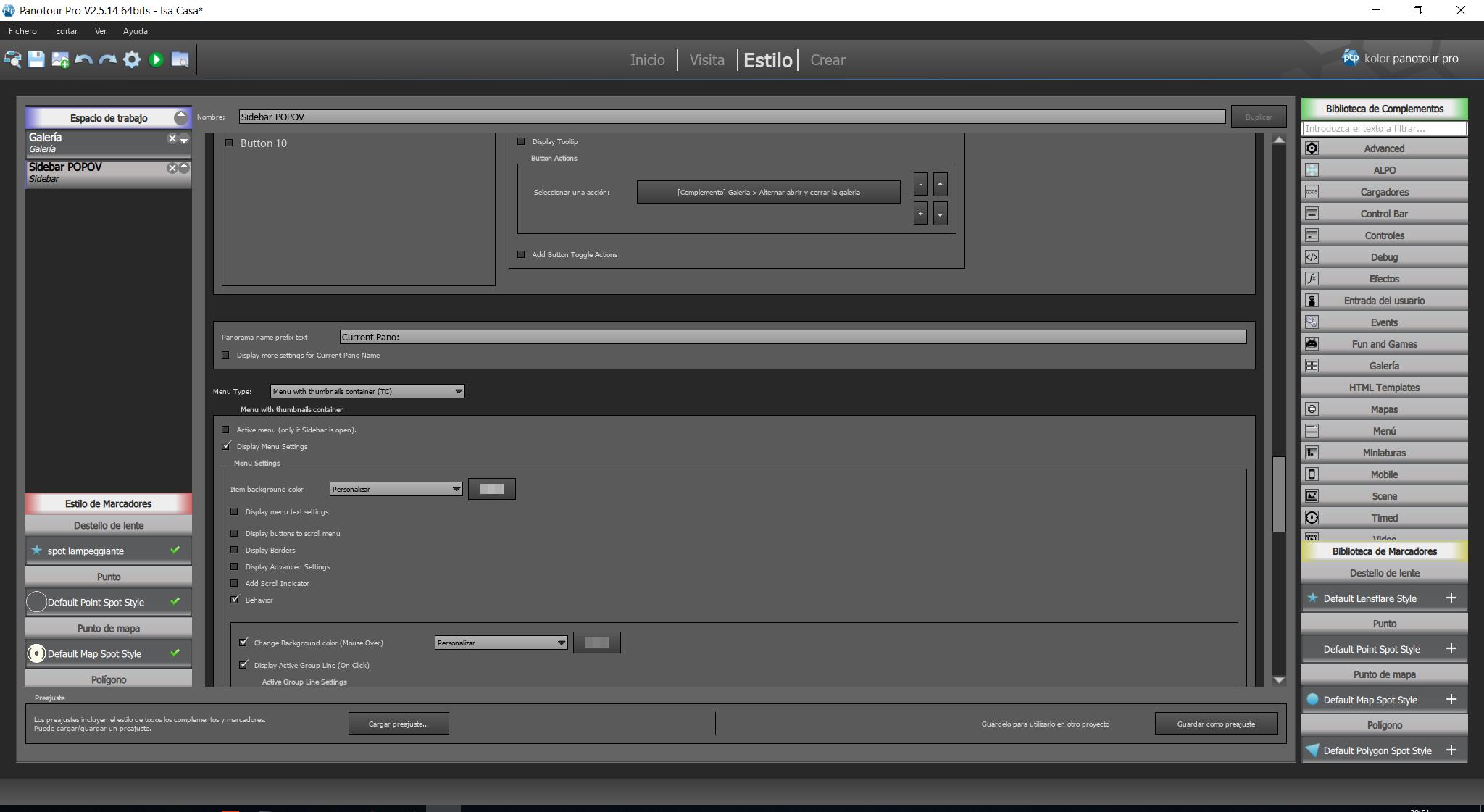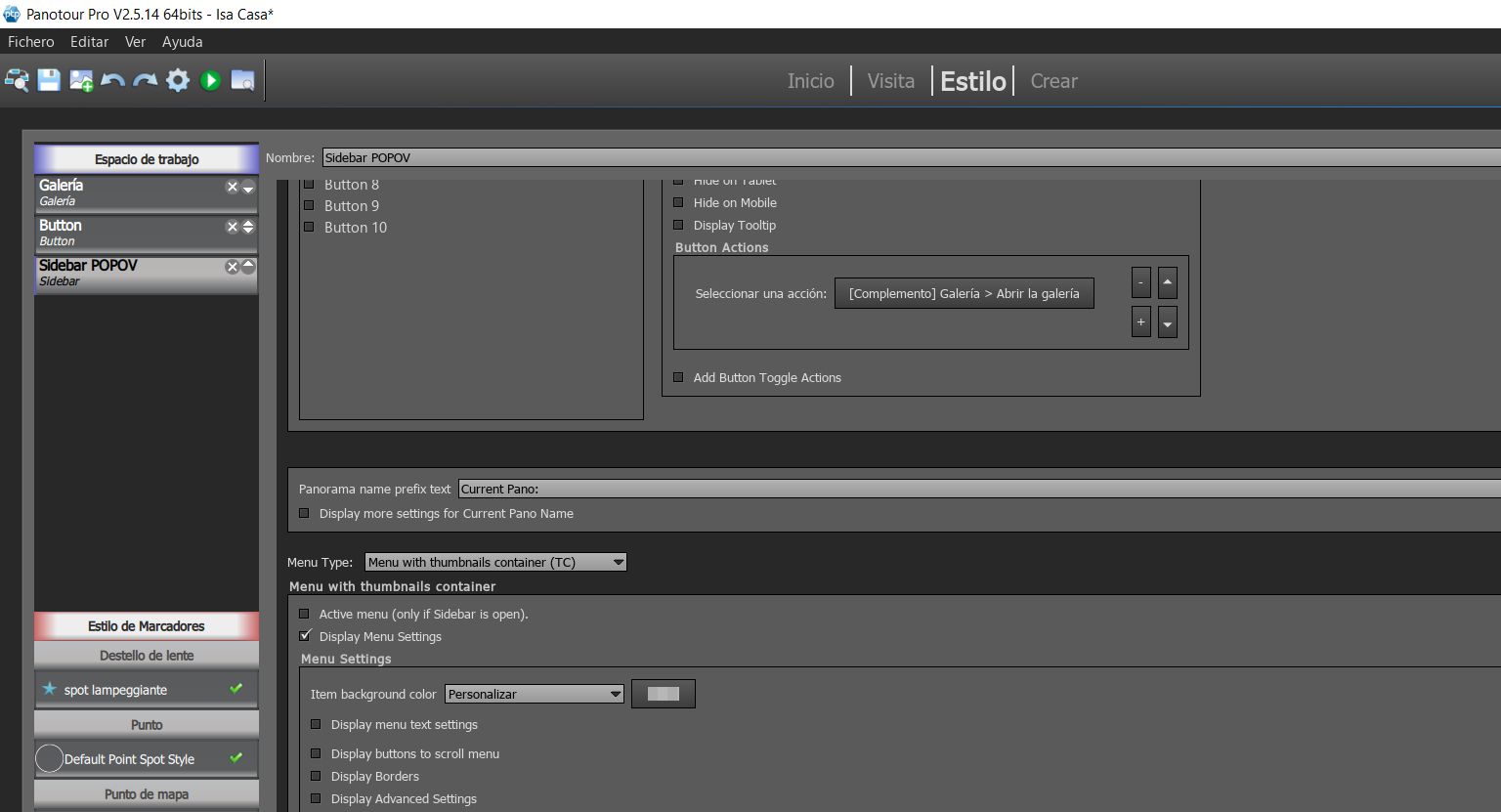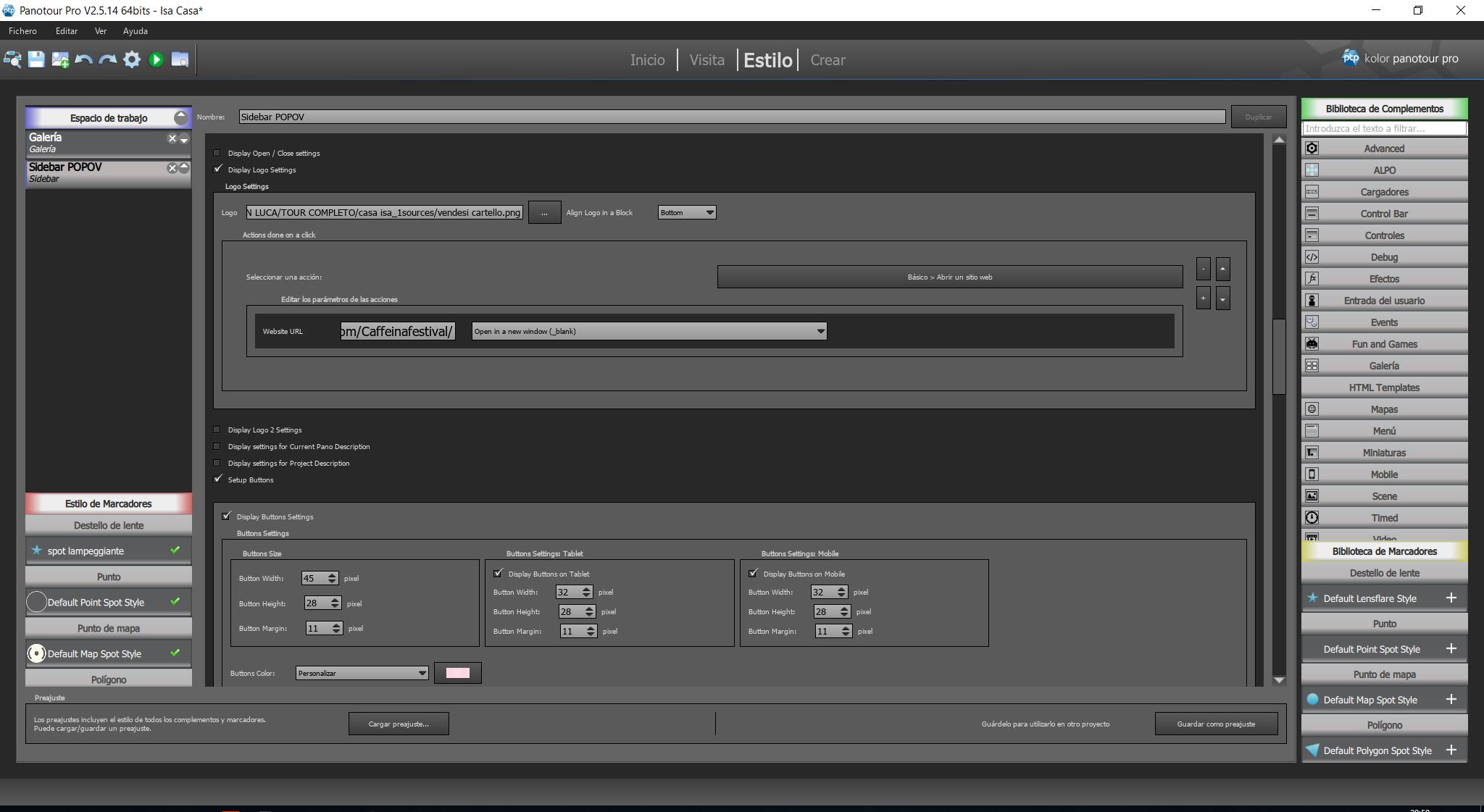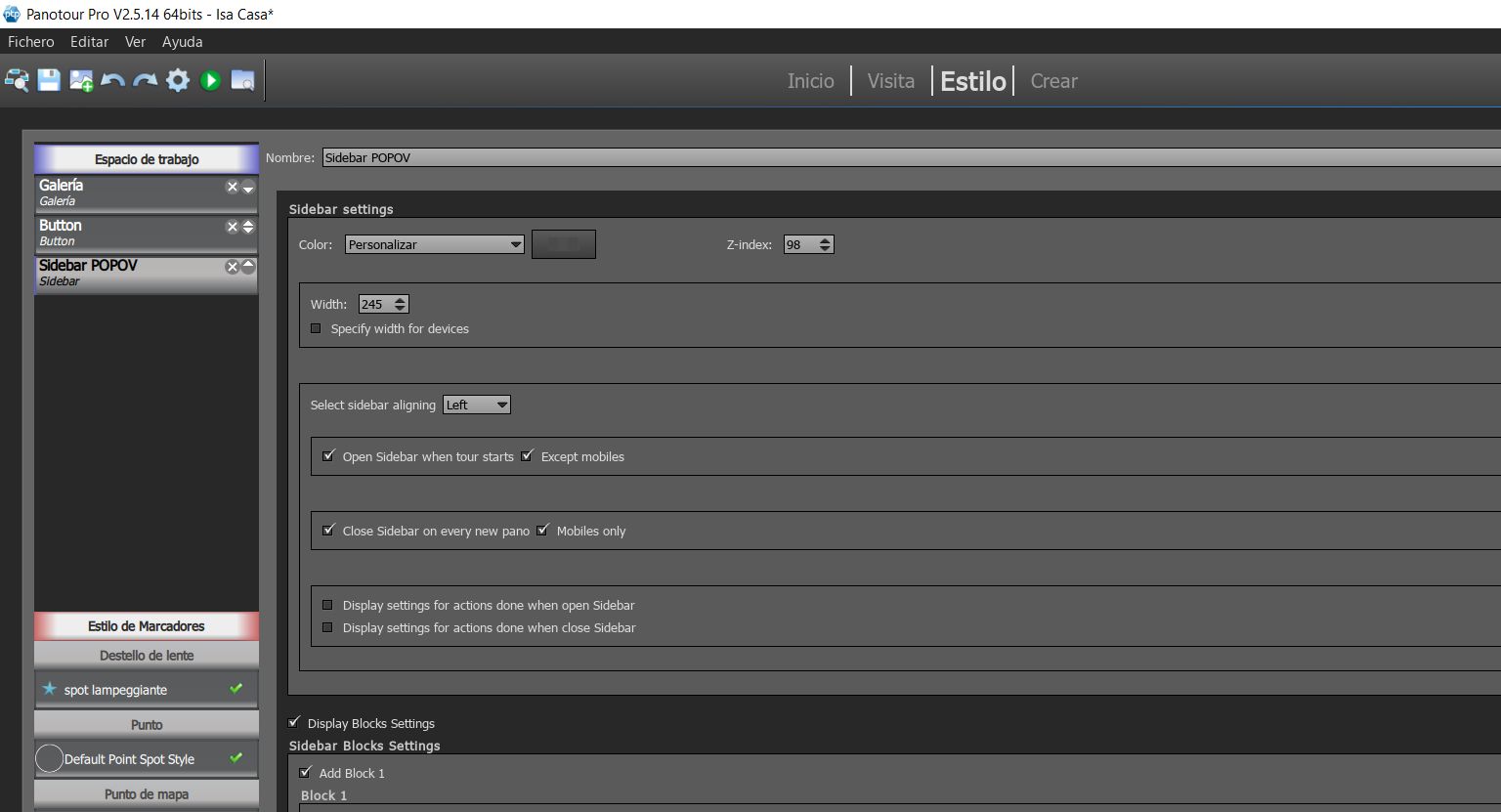 Para incluír botones “Button” en el Sidebar primero debes decirle donde va y después lo qué va a hacer el botón. Del mismo modo que añadiste bloques para el Nombre del Panorama que Estás Viendo (Add Block 1, Current Panorama Name), el Menu (Add Block 2, Menu), y el Logo (Add Block 3, Logo) (Capture_01172019_201648_risultato), debes añadir un bloque para los botones (sería: Add Block 4, Buttons).