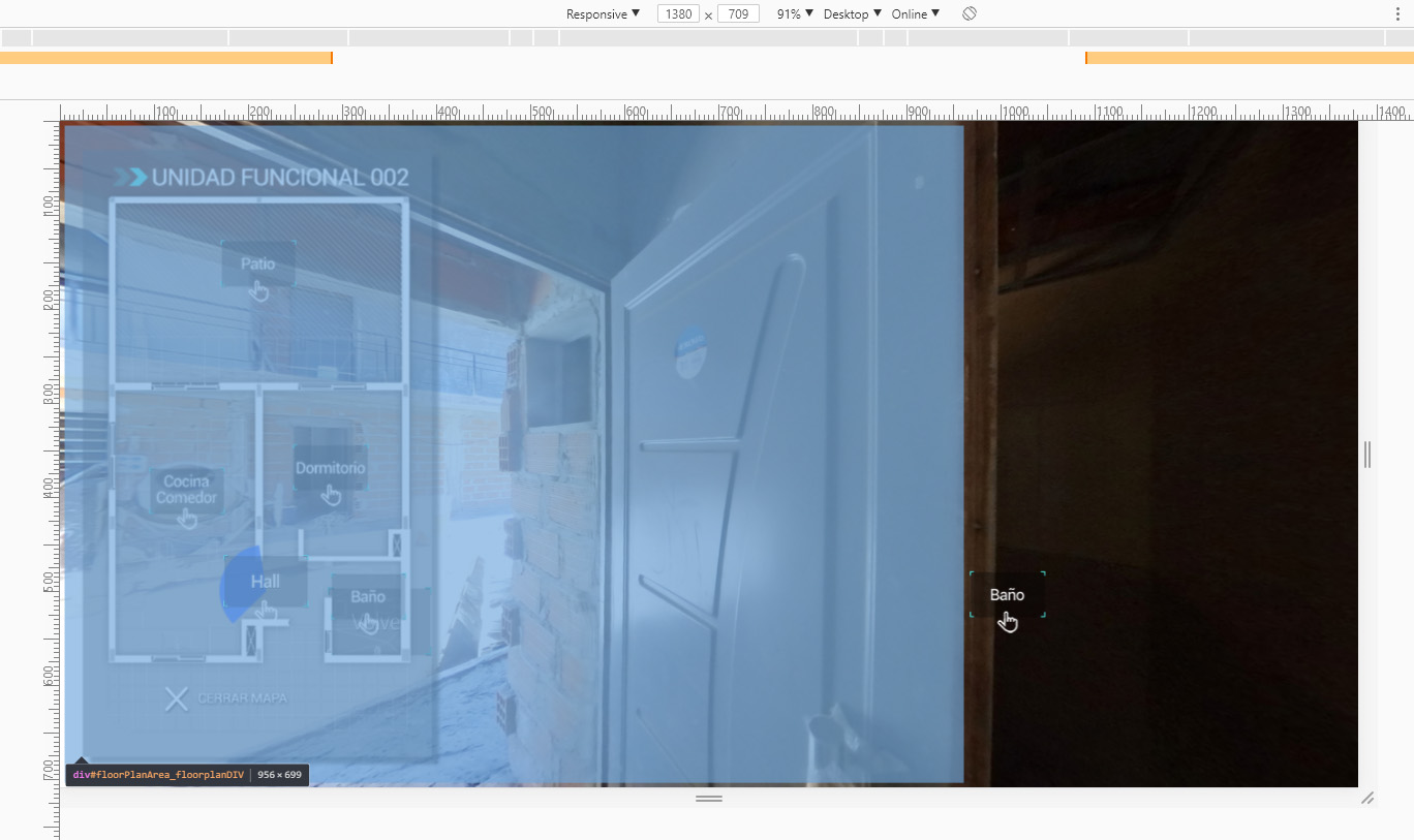 Esto es lo que te comentaba: el area en azul es lo que ocupa el div del plano, por lo que si “clicas y arrastras” dentro de este área, no va a moverse o arrastarse la fotografía esférica de atrás, porque queda, obviamente, por detrás. En cambio, en la zona “no azul” sí que se puede mover el la fotografía esférica.