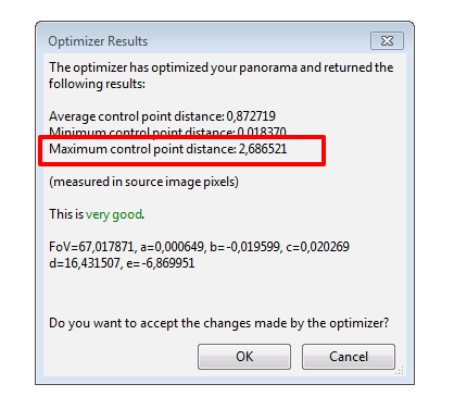 Creo que el valor de distancia máxima entre puntos (55 en tu caso) indica que tienes varios puntos de control erróneos o problemas con el punto de no paralaje. trata de borrar todos aquellos puntos “malos” a través de la funcion : delete worst control points y así mejora esa distancia máxima entre puntos. Trata que ese valor no sea mayor a 5