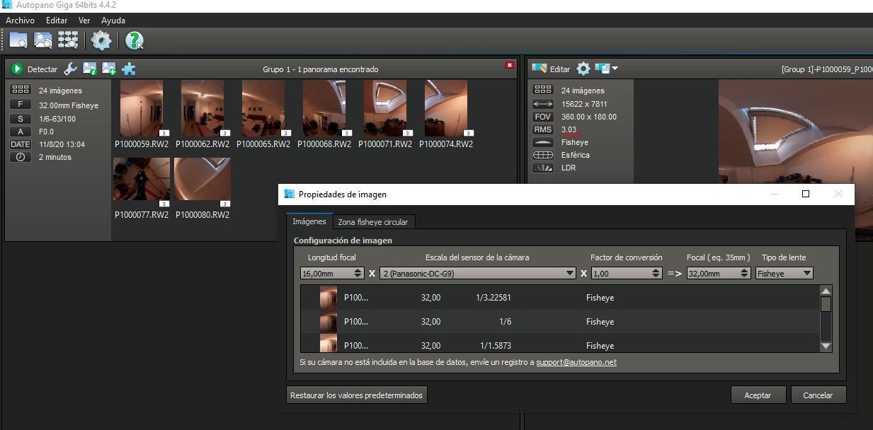 Buenos dias a todos, estoy haciendo una prueba con mi lumix G9 con el Sigma 8mm con adaptador para nikon G a Micro 4/3, y la rotula NN3. Según la calculadora de Panocacher me sale 6 tomas + zenit + nadir y así lo he hecho. Luego estoy usando Autopano Giga para unir las fotos pero ahi estoy encontrando problemas. Estoy usando la detección automatica de autopano pero no me sale la configuración que estoy usando de lente. Alguien sabe que valores debo poner manualmente para esta configuración? Al usar un adaptador afecta en algo? Adjunto captura de Autopano Giga.