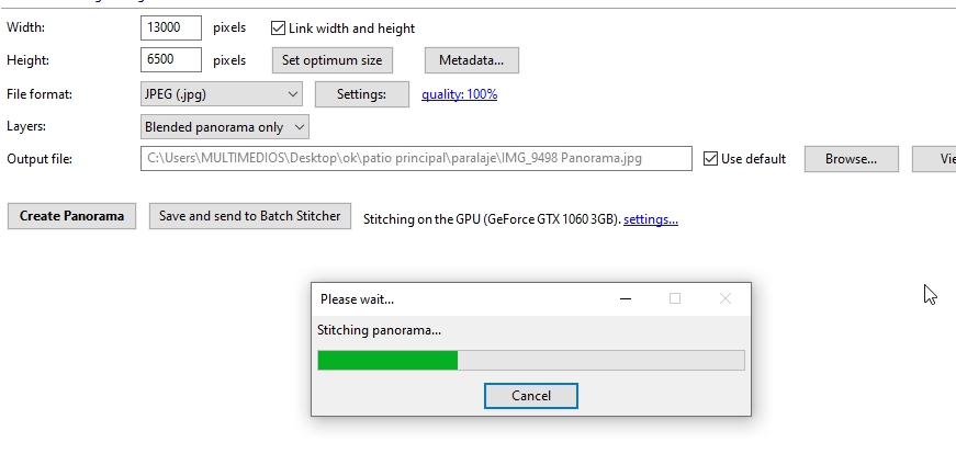 Hola queridos Kamaradas, tengo un gran problema, cuando termino de coser mis imagenes en PTGUI 10.0.7 y estoy listo para “crear panorama” el programa se queda como congelado y ya no avanza, alguien sabe por que sucede esto, intente bajarle el tamaño en pixels pero logicamente tendria menor calidad y ahi si lo crea…